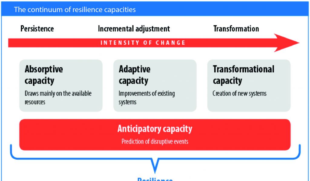 The actions needed to strengthen the resilience of human systems can be understood in terms of resilience capacities, which include Anticipatory capacity, Absorptive capacity, Adaptive capacity, Transformative capacity.