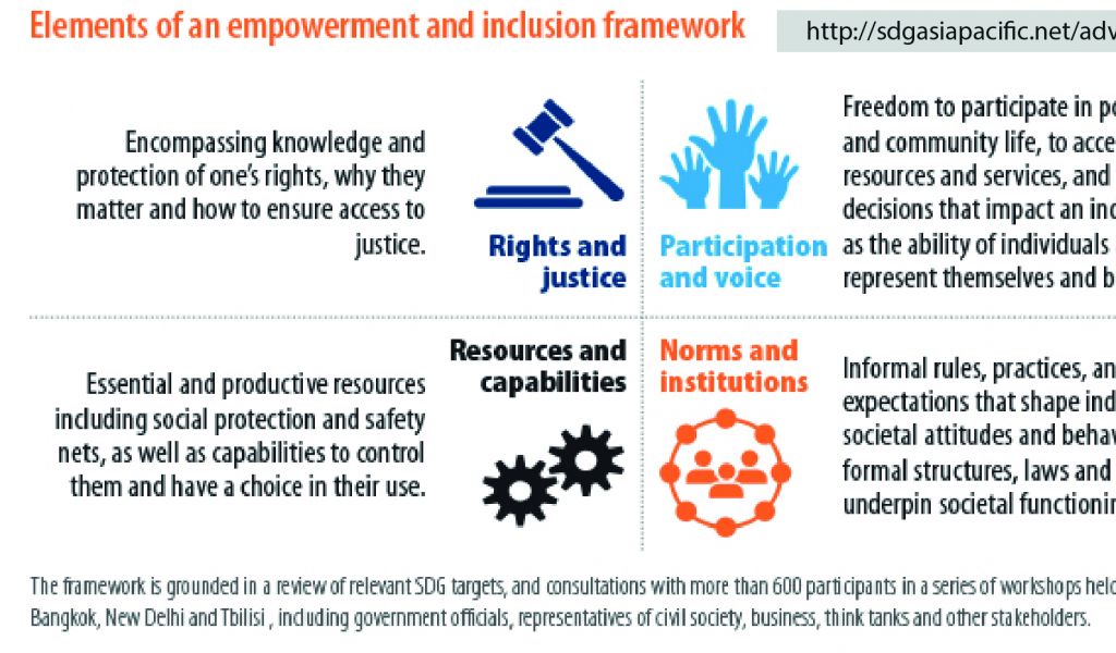 A close review of the SDG targets that are most relevant to empowerment and inclusion points to four interlinked and synergistic elements of a framework for strengthening empowerment and inclusion.
