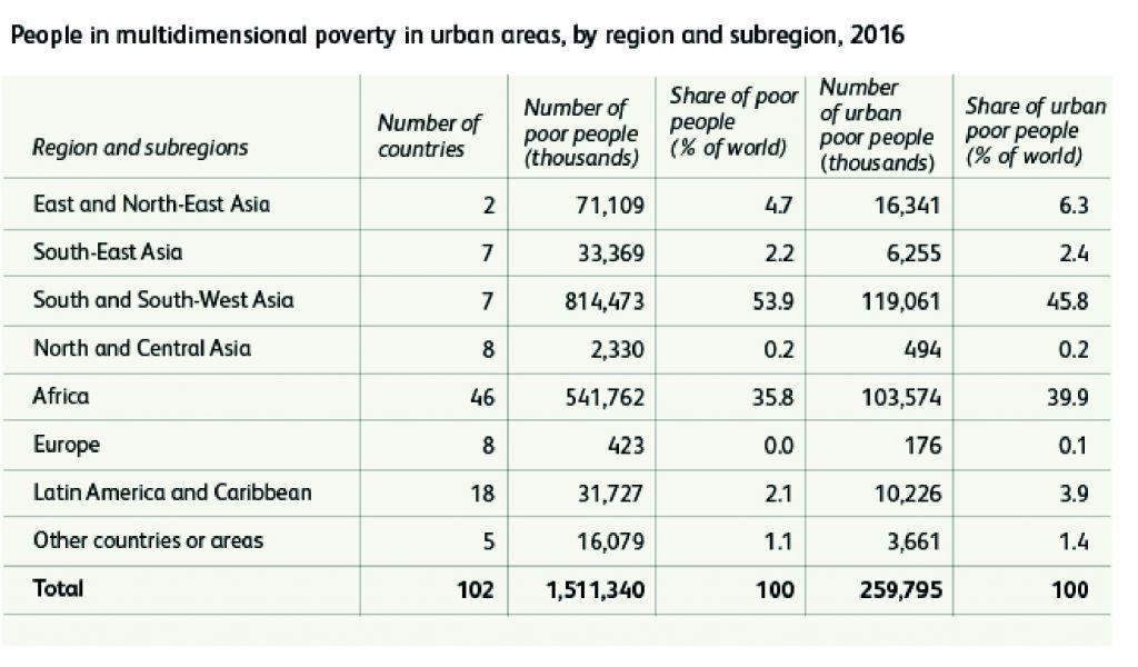 Out of the total 260 million urban people living in multidimensional poverty, the Asia-Pacific region accounts for more than half (54.7 per cent); South and South-West Asia share 45.8 percent of the urban poor population.