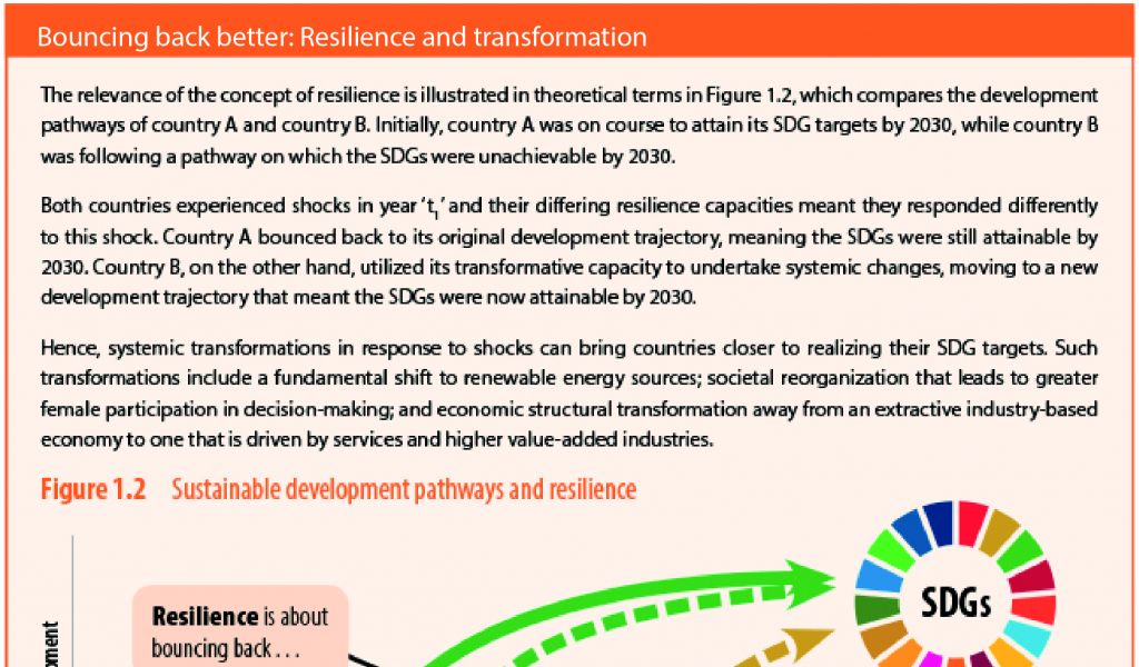 The relevance of the concept of resilience is illustrated in theoretical terms, which compares the development pathways of country A and country B. Systemic transformations in response to shocks can bring countries closer to realizing their SDG targets.