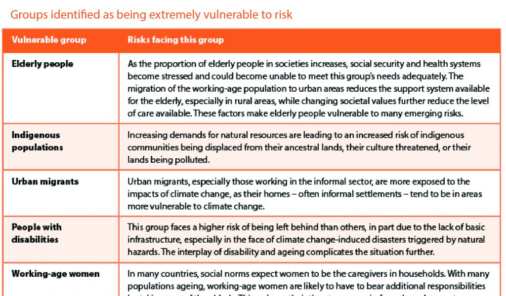 Some groups or communities are disproportionately exposed to risks and are more vulnerable to the changing risk profile of the Asia-Pacific region. It is vital, therefore, to identify vulnerable groups and make special efforts to strengthen their resilience. This figure provides some examples of at-risk groups identified during the sub-regional consultations.