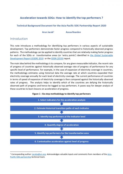 This introduces a methodology for identifying top performers in various aspects of sustainable development. Top performers demonstrate faster progress compared to historically observed progress patterns. The methodology can be applied to identify countries that are relatively making faster progress for each of the SDGs or transformative areas (or ‘entry points’) identified in the Global Sustainable Development Report (GSDR) 2019 or the SDSN (2019) report.