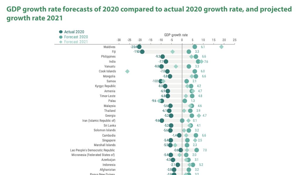 GDP growth rate forecasts of 2020 compared to actual 2020 growth rate, and projected growth rate 2021